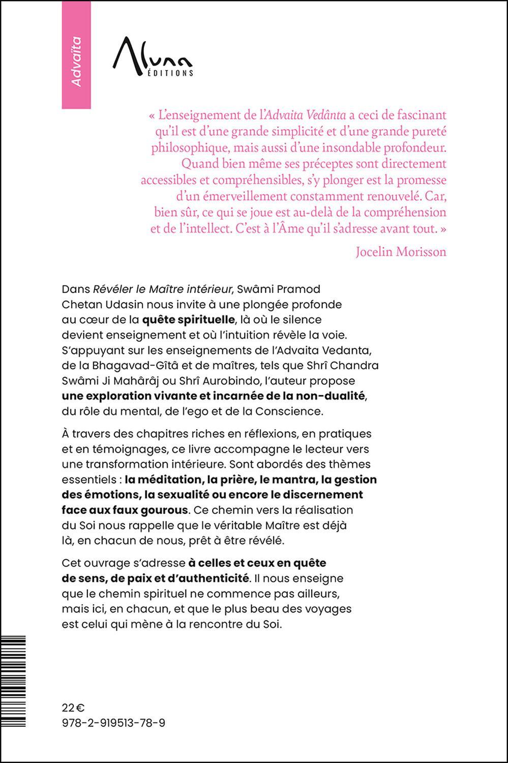 Dans Révéler le Maître intérieur, Swâmi Pramod Chetan Udasin nous invite à une plongée profonde au cœur de la quête spirituelle, là où le silence devient enseignement et où l’intuition révèle la voie. S’appuyant sur les enseignements de l’Advaita Vedanta, de la Bhagavad-Gîtâ et de maîtres, tels que Shrî Chandra Swâmi Ji Mahârâj ou Shrî Aurobindo, l’auteur propose une exploration vivante et incarnée de la non-dualité, du rôle du mental, de l’ego et de la Conscience. À travers des chapitres riches en réflexions, en pratiques et en témoignages, ce livre accompagne le lecteur vers une transformation intérieure. Sont abordés des thèmes essentiels : la méditation, la prière, le mantra, la gestion des émotions, la sexualité ou encore le discernement face aux faux gourous. Ce chemin vers la réalisation du Soi nous rappelle que le véritable Maître est déjà là, en chacun de nous, prêt à être révélé. Cet ouvrage s’adresse à celles et ceux en quête de sens, de paix et d’authenticité. Il nous enseigne que le chemin spirituel ne commence pas ailleurs, mais ici, en chacun, et que le plus beau des voyages est celui qui mène à la rencontre du Soi.
