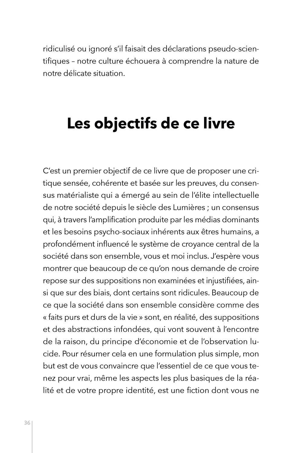 Notre culture tient pour acquis que nous vivons dans un monde constitué de matière en premier lieu. Ce triomphe du matérialisme opposé aux visions religieuses ne laisse pas de place à une troisième voie. Pourtant notre expérience directe de la réalité nous permet de comprendre que le monde qui nous entoure apparaît d’abord dans notre conscience, comme une sorte de reconstitution de ce qui se trouve vraiment là. Ce livre entend révolutionner notre vision du monde en mettant au jour les implications absurdes du matérialisme, puis en proposant une métaphysique non-matérialiste qui s’appuie sur une approche rationnelle et des preuves empiriques solides, dans un langage clair et accessible. L’auteur nous décrit finalement une réalité dans laquelle la conscience est première et la matière est une forme particulière de celle-ci. Ce modèle d’« idéalisme analytique » ne peut que séduire tous ceux qui ne se satisfont pas de la vision matérialiste désenchantée du monde moderne, et ouvre des perspectives colossales quant au devenir de la conscience après la mort et toutes sortes de phénomènes aujourd’hui incompris.
