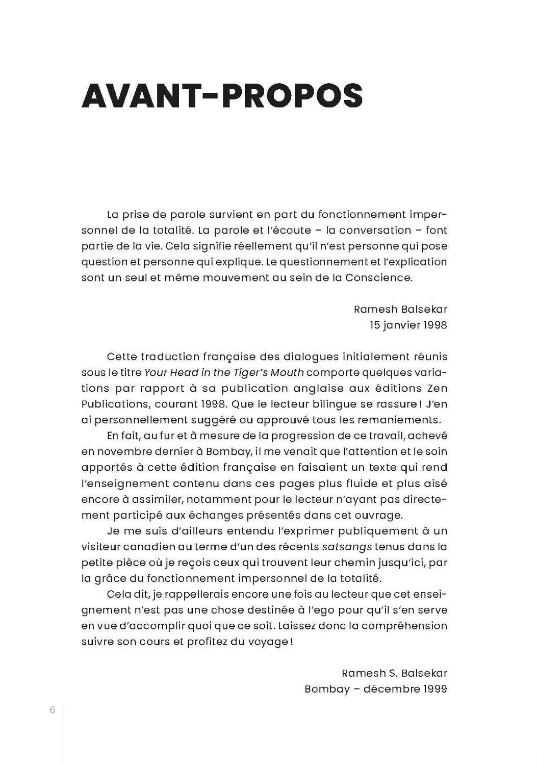En 1997, Ramesh Balsekar souhaite réunir et mettre en forme les dialogues qu’il construit au gré de ses rencontres avec les visiteurs qui viennent le voir dans sa maison de Bombay. Le livre que vous tenez entre vos mains est né de la retranscription de ces entretiens. Ces dialogues sont précis et touchent le cœur de l’Être. Le cœur de l’enseignement de Ramesh Balsekar est l’Advaïta Vedanta, philosophie indienne non dualiste où la distinction entre sujet, Soi, et objet, l’Un, n’existe pas. Selon l’Advaïta, tout est un. Le propos de Ramesh Balsekar est de démontrer qu’il n’y a pas de concepts dualistes auxquels nous devrions nous identifier parce que notre Vraie Nature transcende ces concepts. Nous sommes l’Un, Ce qui Est, sans forme et sans nom, ce que nous étions déjà avant notre naissance.